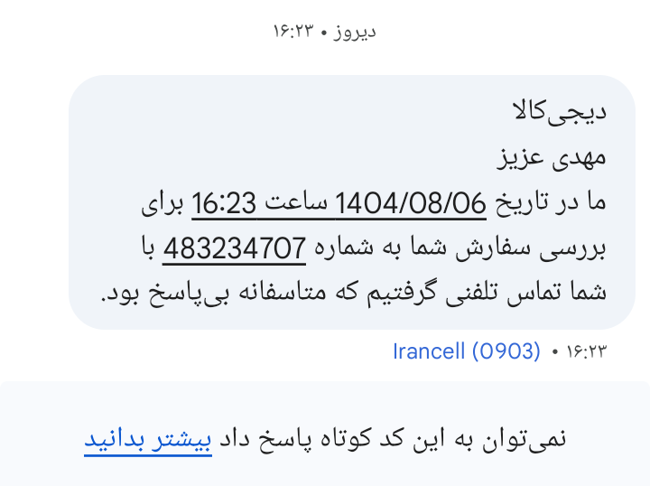 هرچقدر فریاد زدم “الو؟!”، پاسخی نشنیدم. دقیقاً پس از قطع شدن تماس، پیامکی دریافت کردم با این مضمون: “با شما تماس گرفتیم که متاسفانه بی پاسخ بود”
